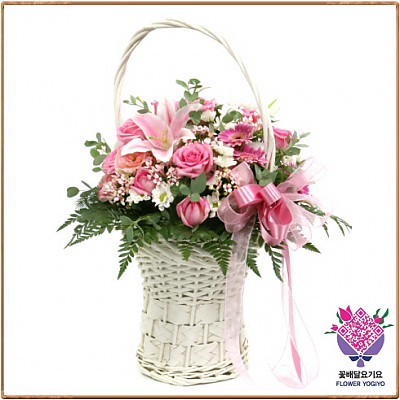 장미와 계절꽃 및 그린소재를 혼합하여 바구니에 꽃꽂이를 하는 상품이며