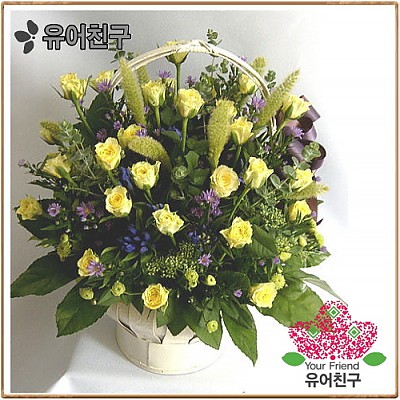 장미와 계절꽃 및 그린소재를 혼합하여 바구니에 꽃꽂이를 하는 상품이며